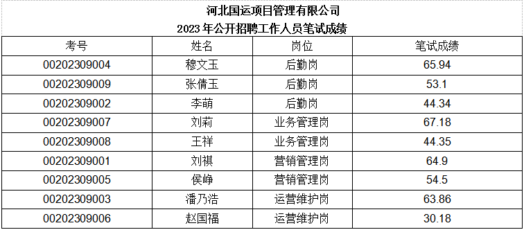 根據(jù)《滄州市安居集團有限公司2023年度招聘公告》。于2023年9月14日對符合筆試資格條件的人員進行了筆試,現(xiàn)將筆試成績予以公示。