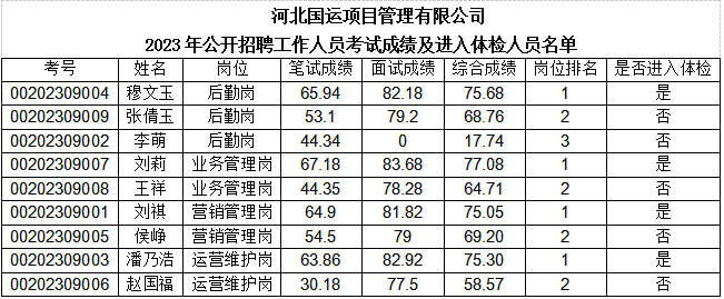 滄州市安居集團有限公司2023年公開招聘工作人員面試于2023年9月14日完成。現(xiàn)將綜合成績與進入體檢人員名單進行公示。