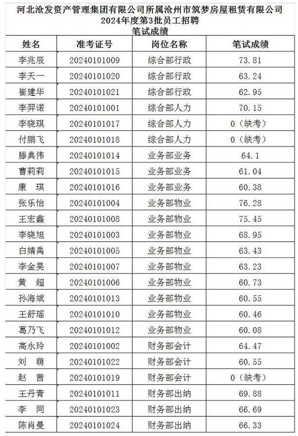 根據(jù)《河北滄發(fā)資產(chǎn)管理集團(tuán)有限公司所屬滄州市筑夢(mèng)房屋租賃有限公司2024年度第3批員工招聘公告》。于2024年8月06日對(duì)符合筆試資格條件的人員進(jìn)行了筆試,現(xiàn)將筆試成績(jī)予以公示。